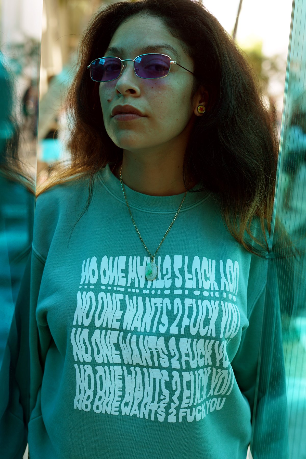 White Silkscreen graphic on the front/ Radiant Maelstrom Logo printed on the back - Pigment Dyed Crewneck Sweatshirt